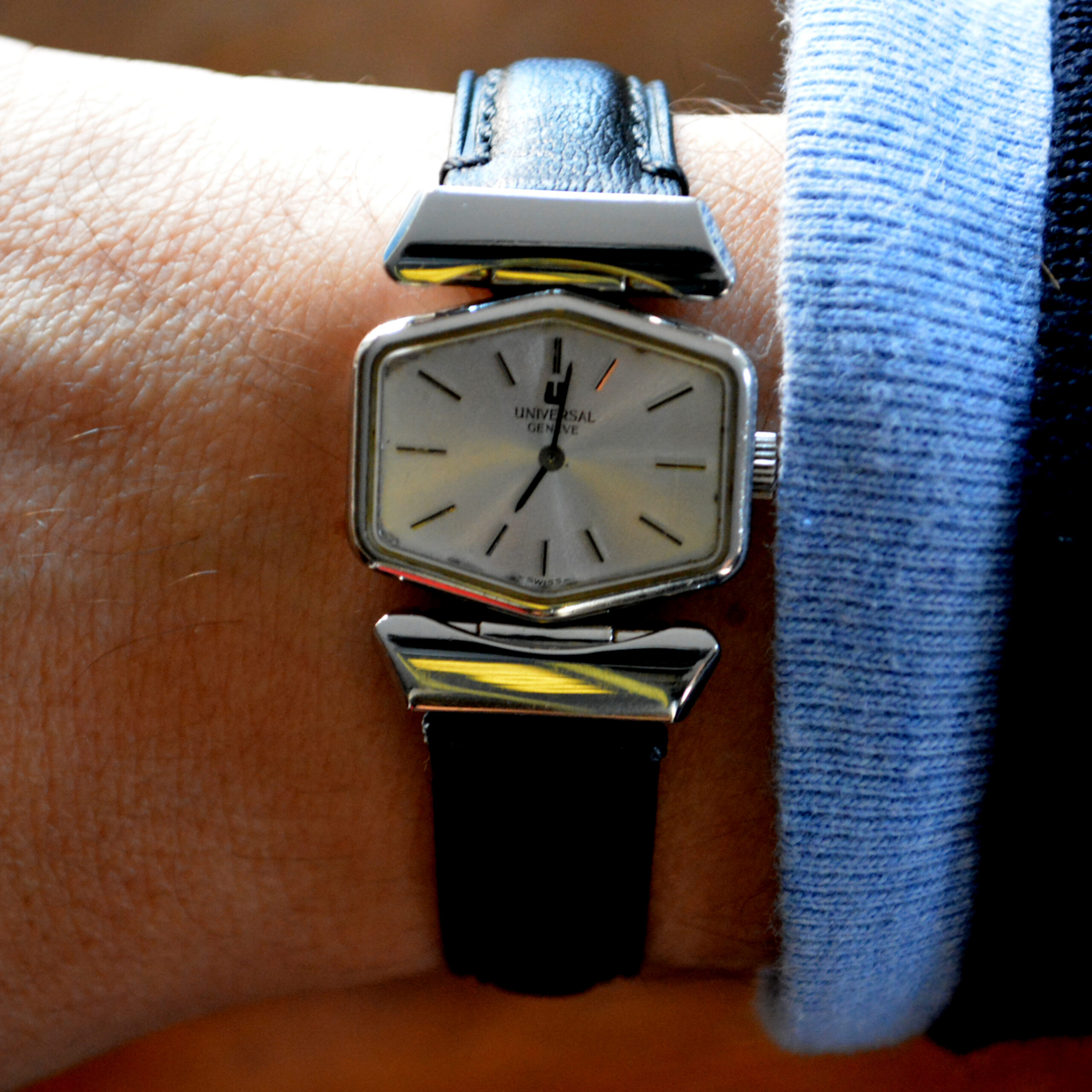 The negative space works to deconstruct the overall integrity and the feeling of wearing it. At its center an hexagon frames the main dial, but the wings not only add depth and functionality to better fit the wrist, but also stretch the more conventional hexagonal shape, better fitting a female wrist, to a more muscular tonneau case. Such deconstruction of the watch case is unique in adding an extra layer of understanding and pleasure. I supposed the watch has been designed to both fit men and women depending on the set up. Removable wings are kept together by an extra set of quick release pins. The overall design is so undermined by the general appearance of the watch, that if not seen in both configurations, the watch would look a simple standard iteration of an hexagonal shape with drop lugs, characteristics of 1950 design. Mine is just a bare speculation, but even if the design is not of Genta, the designer who contributed to shape such an unfamiliar case, belonging to the Universal Geneve family, deserves all the respect the brand has accumulated over the years, sadly lost over time. A forgotten brand. Universal Geneve has not only given birth to Bi-compax and Tri-compax chronographs, Ellipse and Polerouter. It distinguished itself still today for the level of competence and creativity introduced. It is unfortunate that little is known about the history of many models. Lots of designs are unknown; conditions of watches in the traded market are very bad and often spoiled by their former glory